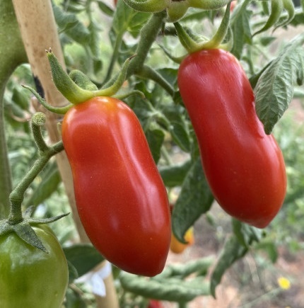 Tomate allongée. Fruits très fermes d’environ 12 cm pesant autour de 100 g, rouge brique avec léger collet vert. Chair dense et charnue, idéale pour les conserves.